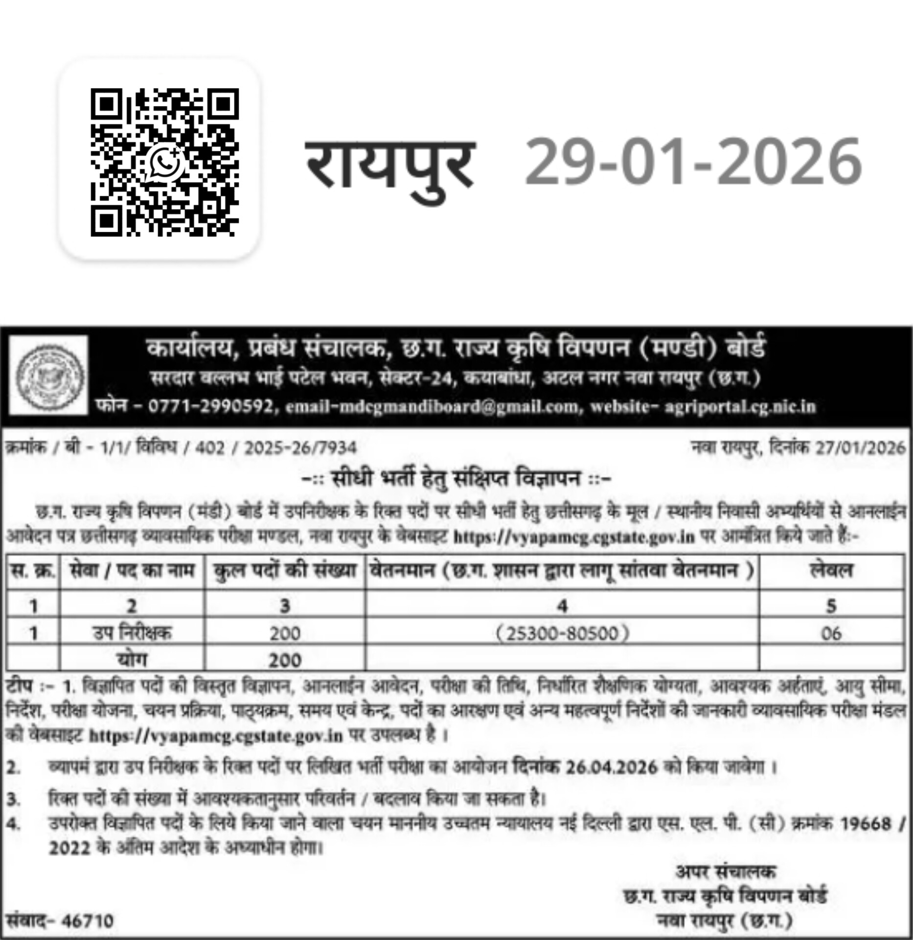 सूचना ! CG व्यापम द्वारा 'मंडी उप निरीक्षक ' 200 पदों पर 26 अप्रैल 2026 (संभवतः) को लिखित परीक्षा का आयोजन किया जायेगा।