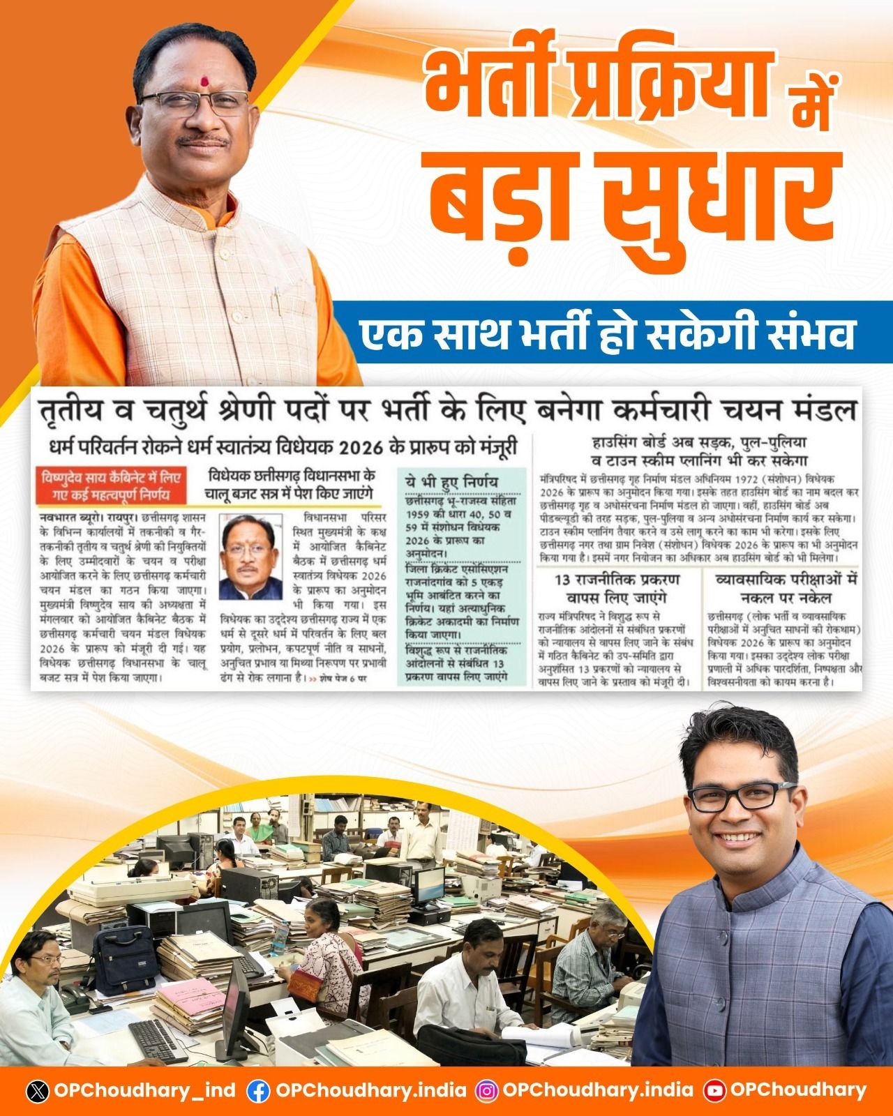 | CG कर्मचारी चयन मंडल बनने से भर्ती प्रक्रिया ज्यादा fast और clear होगी, एक ही प्लेटफॉर्म से कई भर्ती आएंगी, |